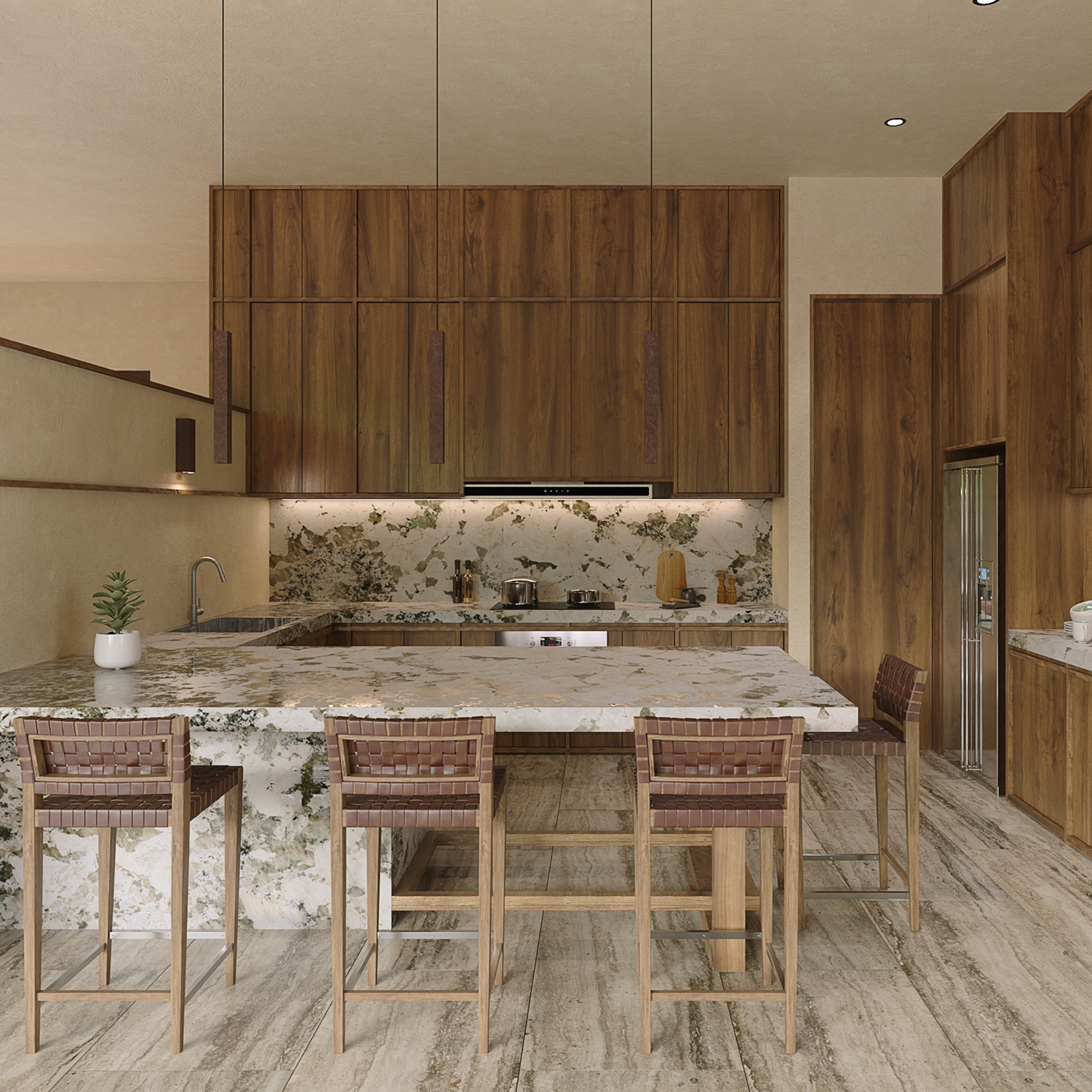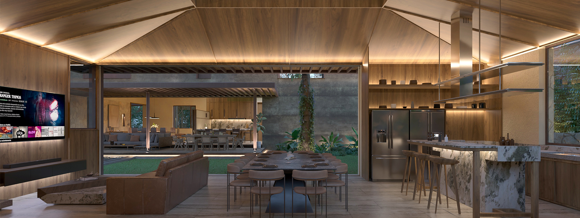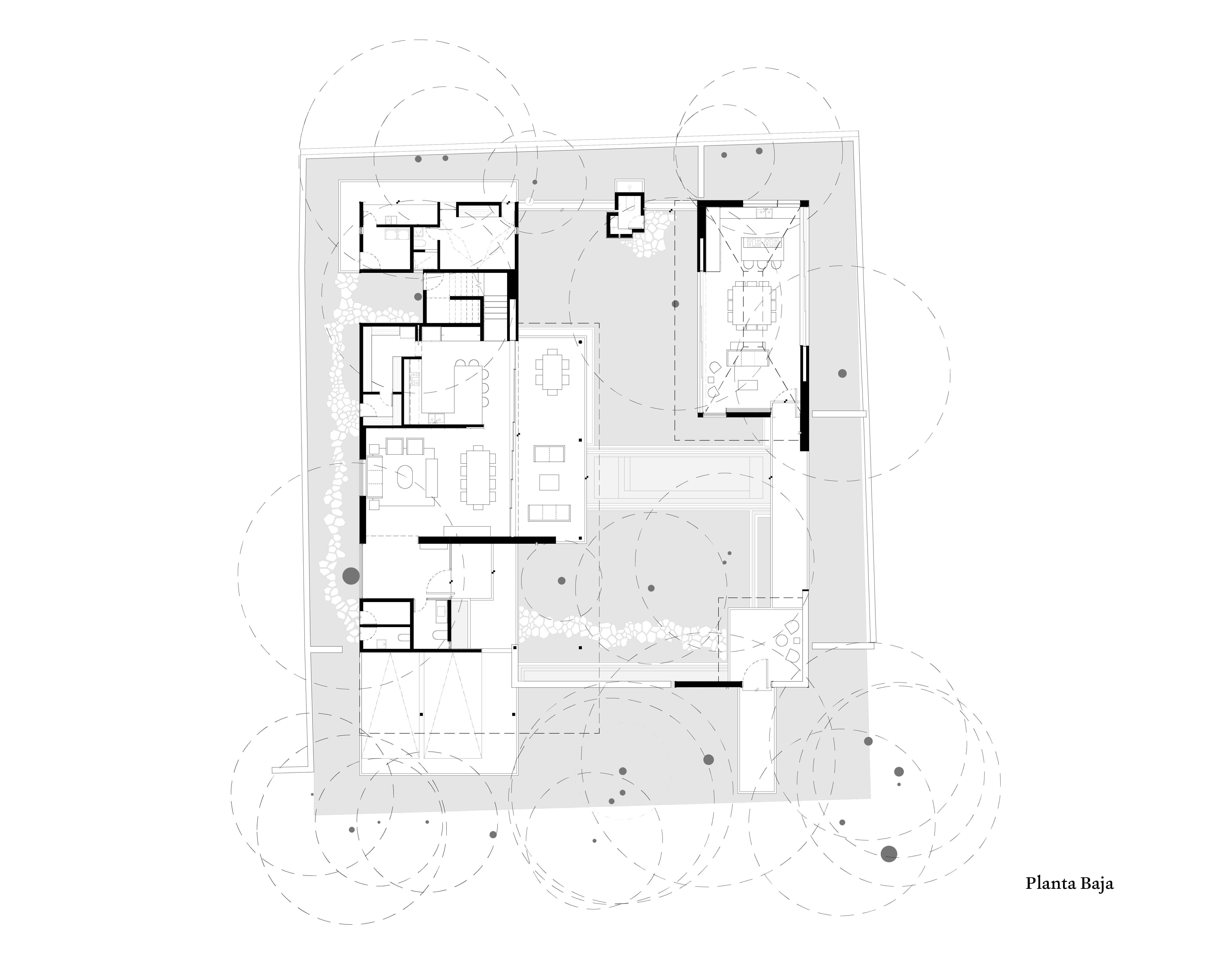 Inside of what used to be the Hacienda Sodzil we found this project immersed among the pre-existing vegetation, a house made up by a series of volumes connected by paths and frames accompained by diffuse lighting generated by the treetops. Materials with a natural appearance such as wood, natural stone and corten steel (also known weathering steel) give the project richness over time and allow the house to reconcile with nature and the pre-existing elements of the former Hacienda.