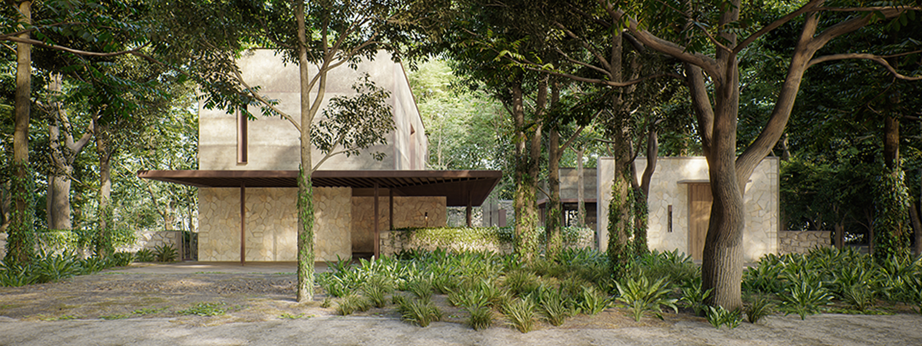 Dentro de lo que una vez fue la hacienda Sodzil, se encuentra el proyecto inmerso entre la vegetación preexistente, una casa compuesta por una serie de volúmenes conectados por recorridos y remates acompañados por la iluminación difusa que se genera entre las copas de los árboles. La materialidad con apariencia natural como madera, piedra y acero oxidado le aportan mayor riqueza al proyecto con el paso del tiempo y le permiten a la casa conciliar con lo natural y los elementos preexistentes de la ex hacienda.