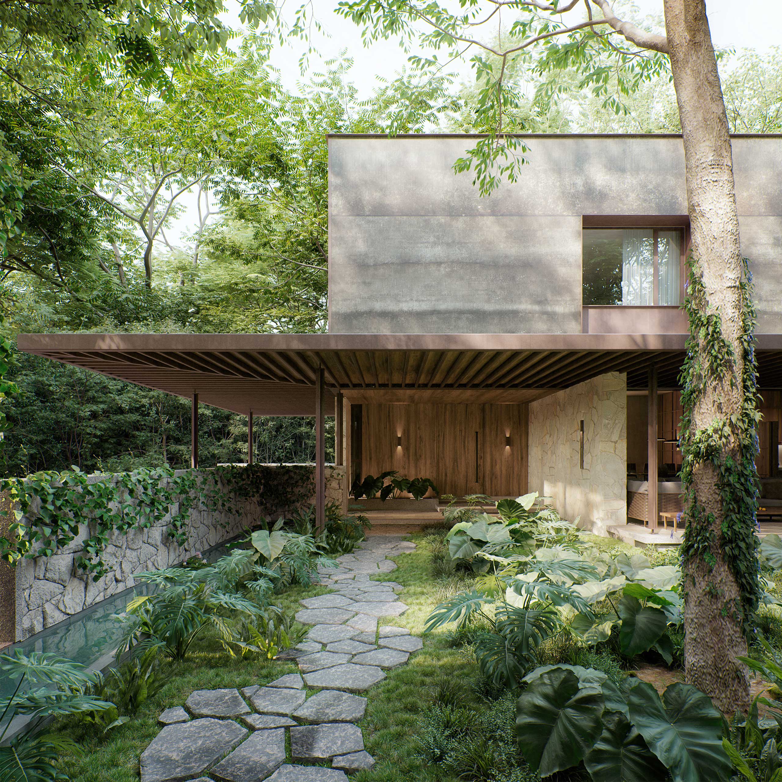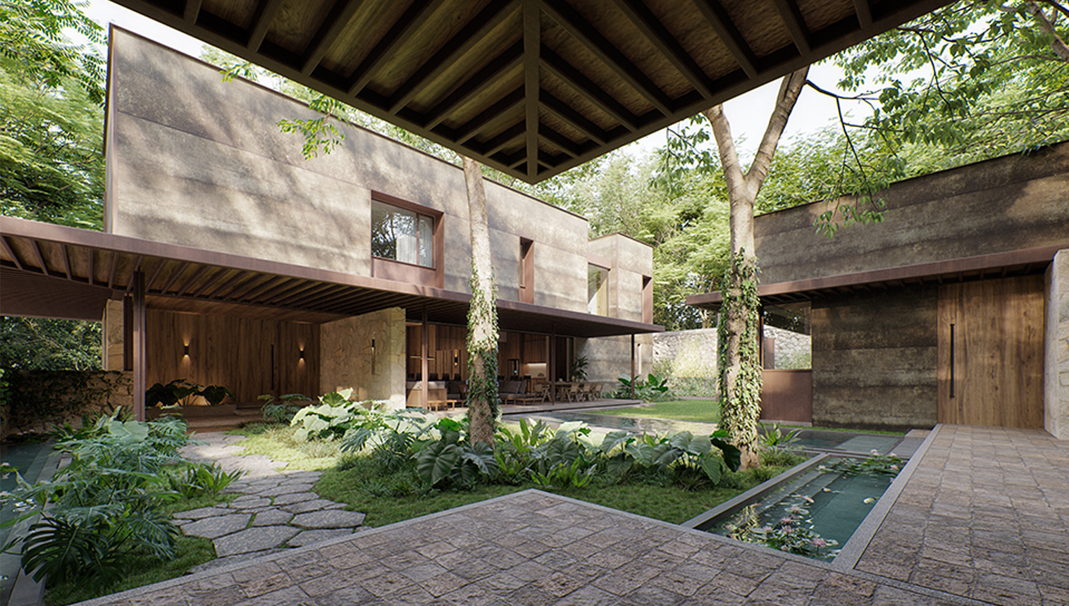 Inside of what used to be the Hacienda Sodzil we found this project immersed among the pre-existing vegetation, a house made up by a series of volumes connected by paths and frames accompained by diffuse lighting generated by the treetops. Materials with a natural appearance such as wood, natural stone and corten steel (also known weathering steel) give the project richness over time and allow the house to reconcile with nature and the pre-existing elements of the former Hacienda.