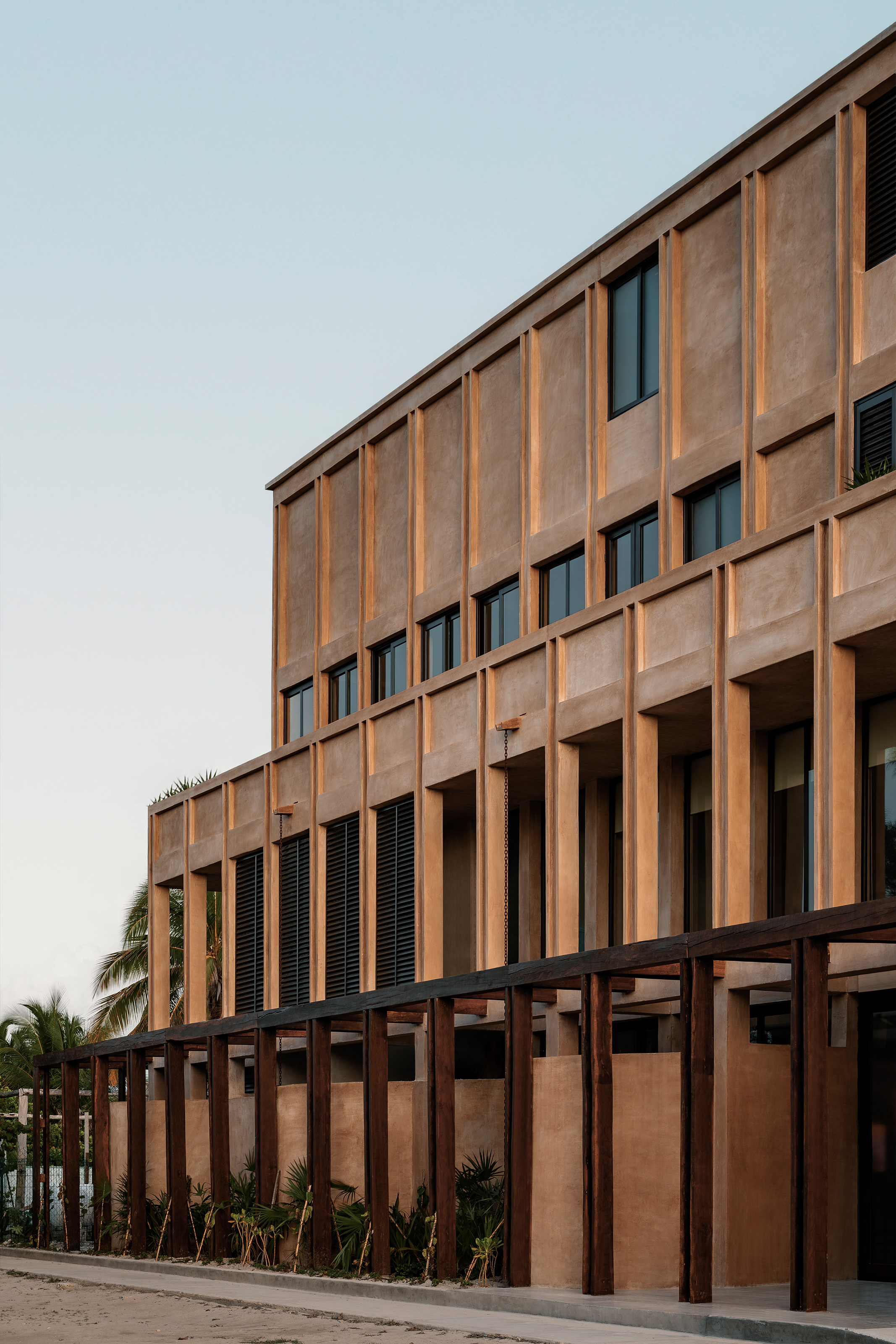 El basamento, un cinturón de columnas de madera, aligeran la escala humana. Conforme sube el nivel el edificio se remete evitando que sea una masa pesada en el paramento.